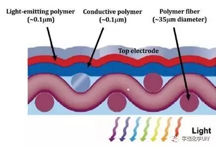 这种织物可以进一步涂覆透明的聚合物,使其无法渗透液体和气体,同时保持其导电性,并为湿度和氧气提供保护层,而不至于明显改变其透射特性。微米级的导电金属线和透明聚合物纤维编织在一起,并且嵌入于光学透明的填充聚合物中。涂覆导电聚合物的基底形成电极,使其发光聚合物和顶部电极共同形成完整的OLED组件。